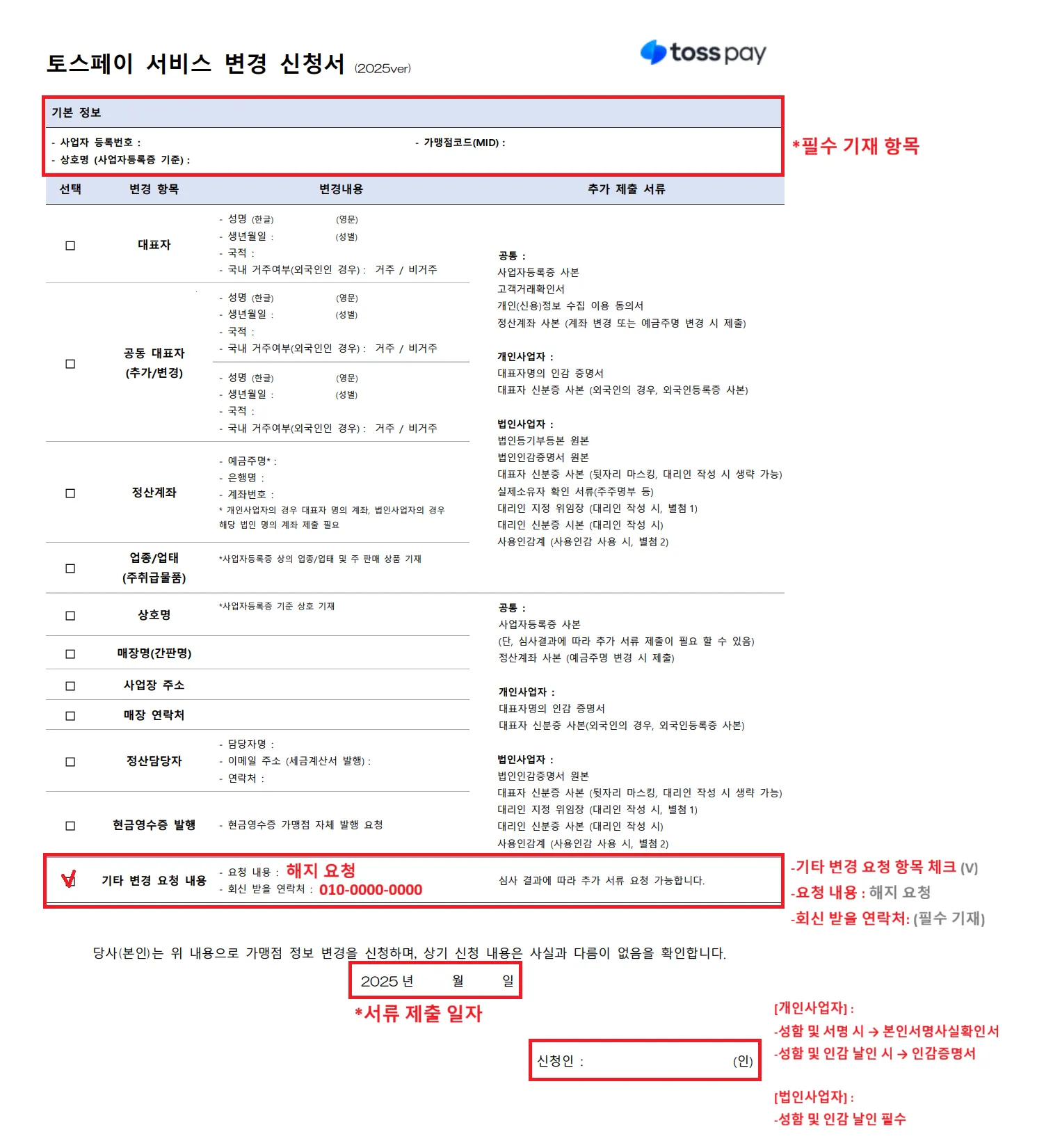 변경 신청서 내 가맹점코드(MID)는 공란으로 제출 가능해요.