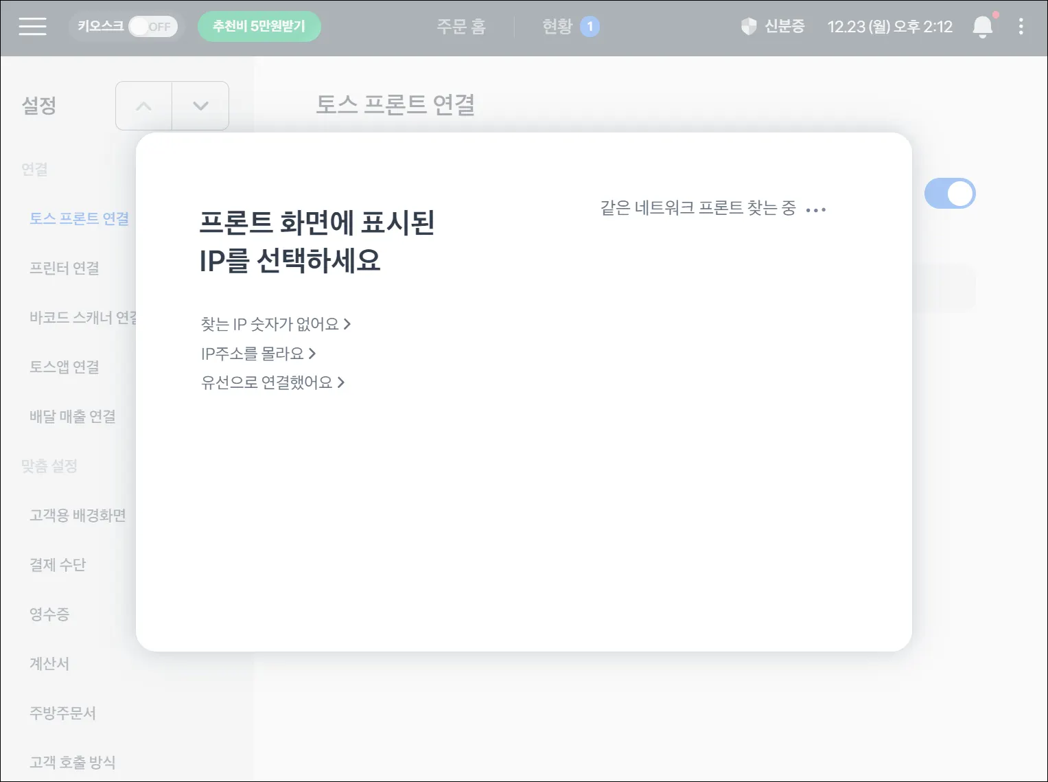 포스와 프론트를 같은 와이파이로 연결한 뒤, 토스포스 앱을 실행 해주세요.