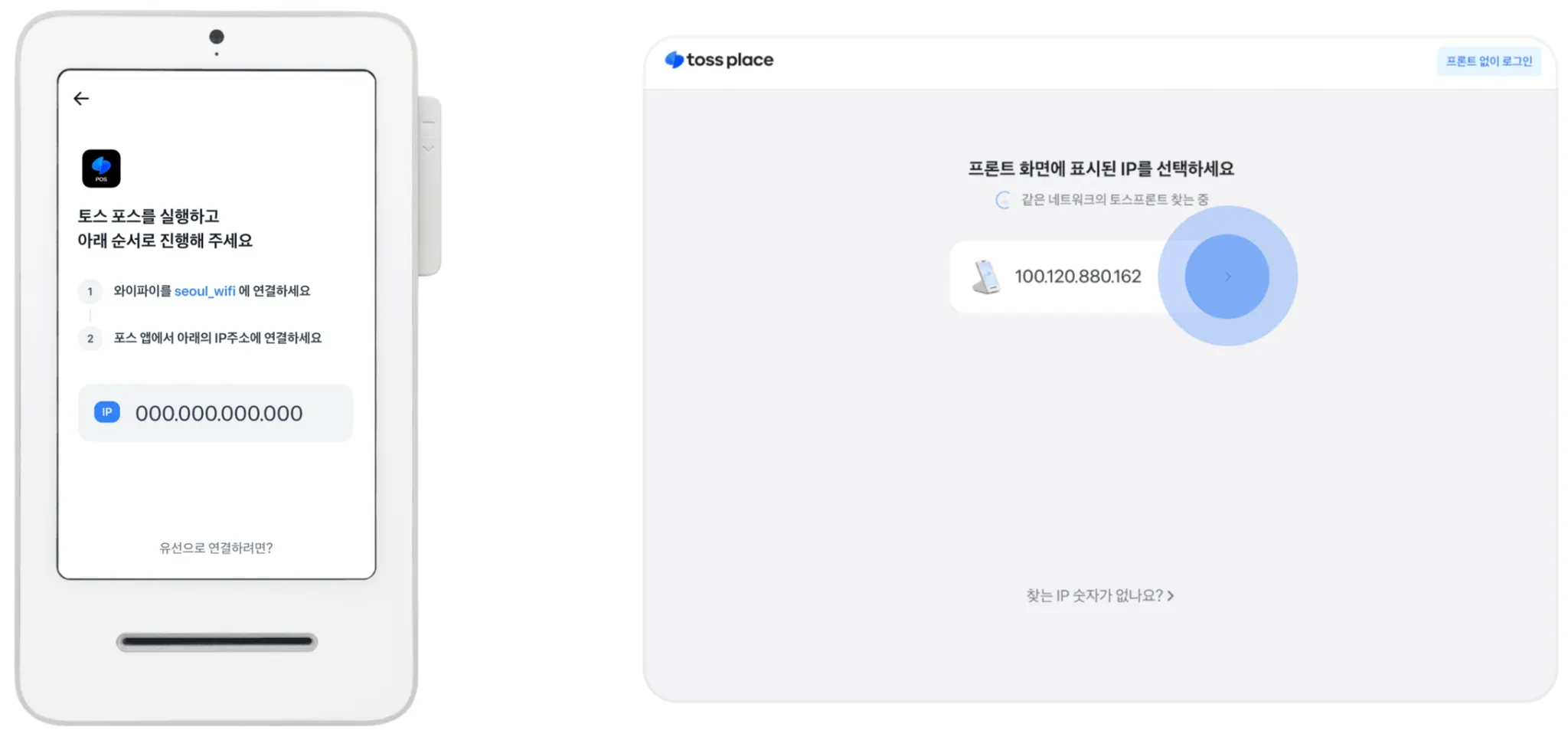 토스포스와 프론트 단말기가 같은 wifi에 연결되어 있다면, 바로 연결돼요.