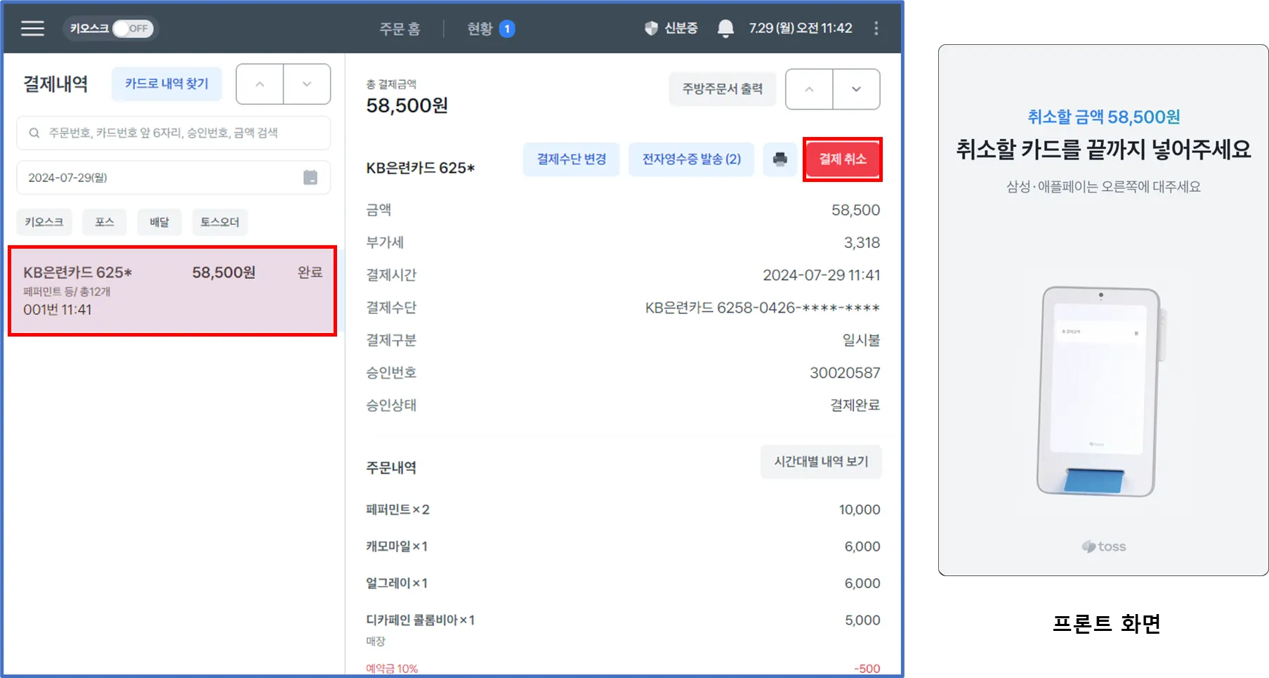 포스 왼쪽 상단 (≡) → 결제내역에서 취소 할 내역을 선택하고 결제취소를 눌러주세요.
