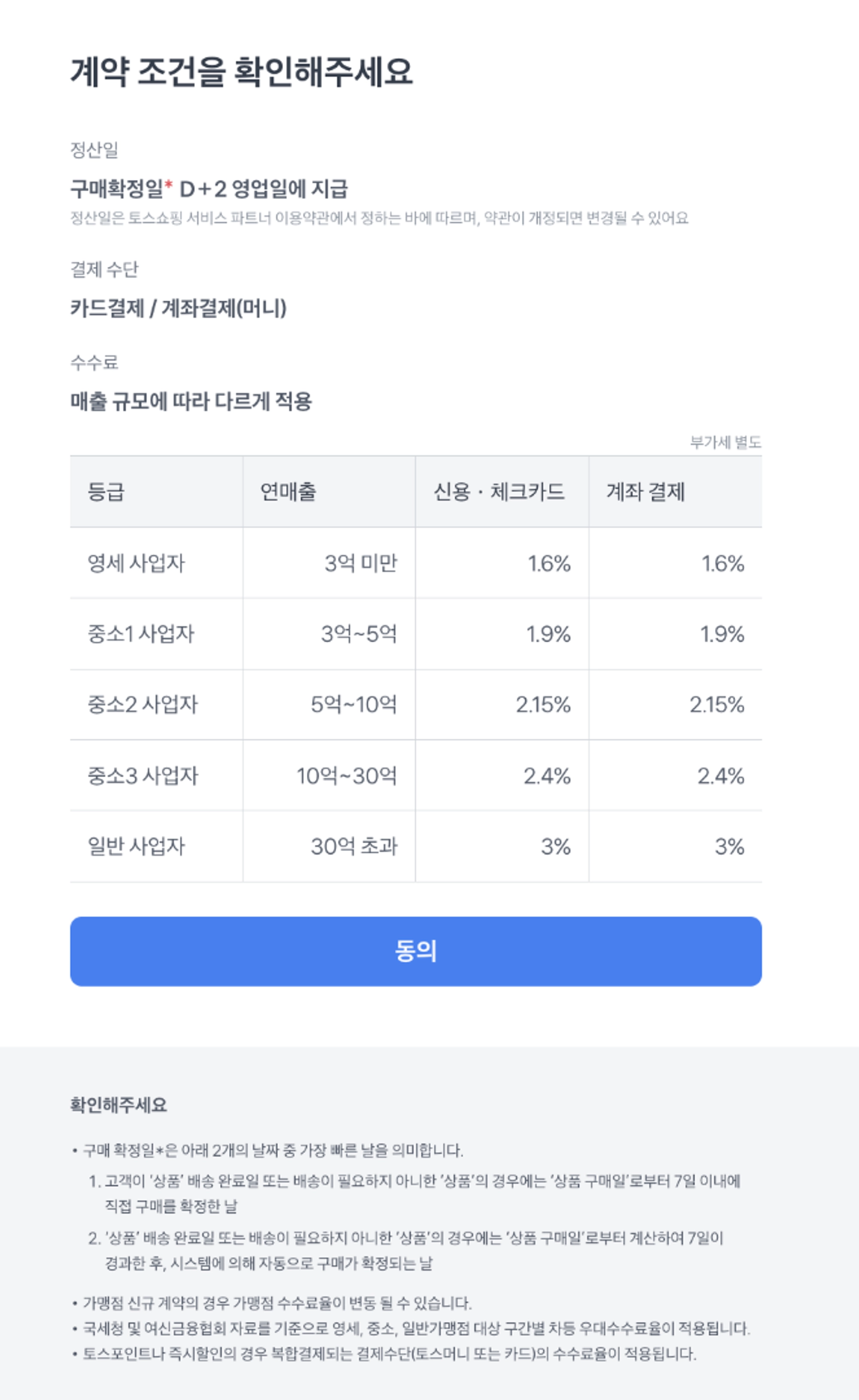토스쇼핑 서비스는 토스 앱 내에서 상품 판매 및 결제를 하고있어 모든 입점사의 계약 조건이 같아요
