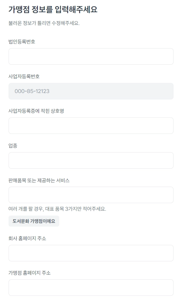 첨부한 사업자등록증에서 불러온 정보를 확인하고 잘못된 정보가 있다면 수정해 주세요