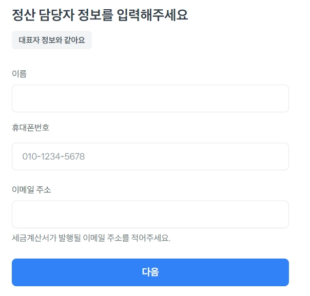 대표자 정보와 같아요를 누르면 대표자 정보로 자동으로 채워져요