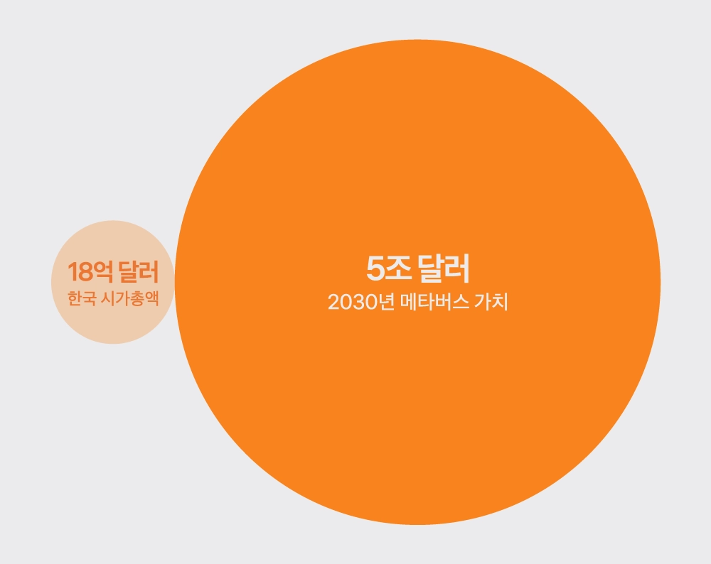 참고로 한국 증시 전체의 시가총액*이 2,007조원이에요. 두 숫자를 비교해보면 맥킨지가 메타버스 시장의 가치를 얼마나 크게 보고 있는지 알 수 있죠.