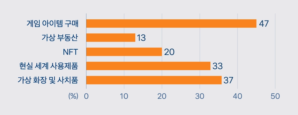 돈을 써본 사람들 중 절반은 게임 아이템을 구매한 경험이 있었고요. 3명 중 1명은 “메타버스 플랫폼”하면 생각나는 생활용품이나 꾸미기 위한 아이템을 사봤다고 답했습니다.