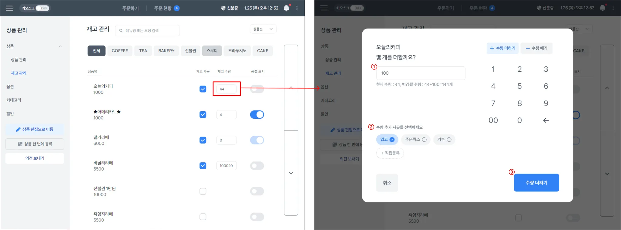 재고 수량 클릭 시 잔여 수량을 수정할 수 있어요.