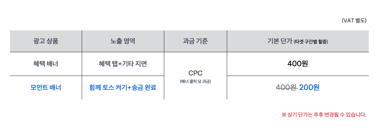 항상 토스 광고 서비스를 이용해주시는 회원 분들께 감사드리며, 2023년 7월 1일(토) 적용될 toss ads 모먼트 배너 런칭 프로모션을 공지드립니다.