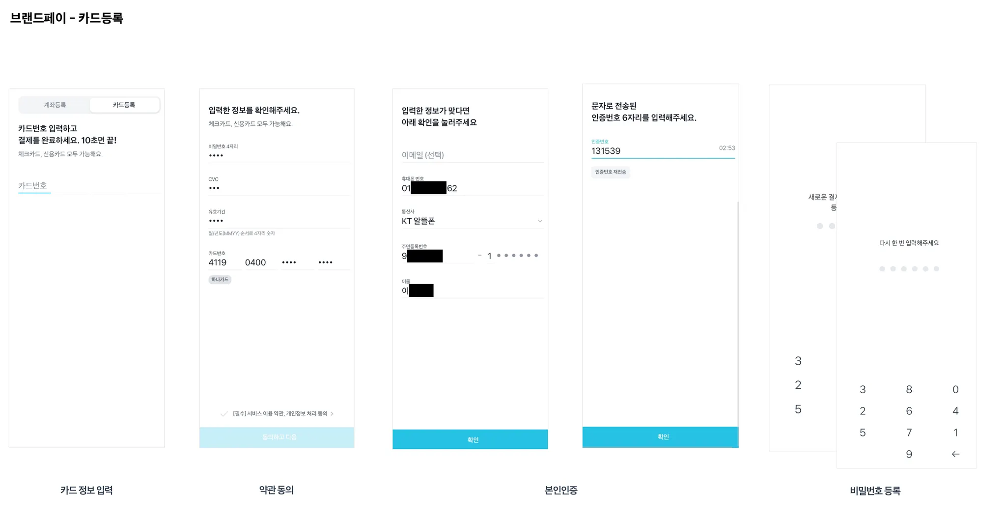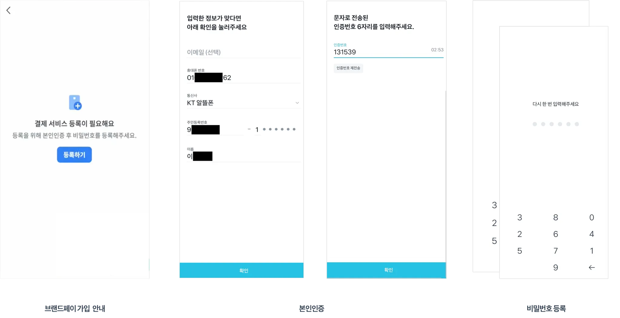 브랜드페이는 최초 본인인증 과정을 통해 가입하며, 이후 본인 명의 결제수단만 등록 가능합니다.