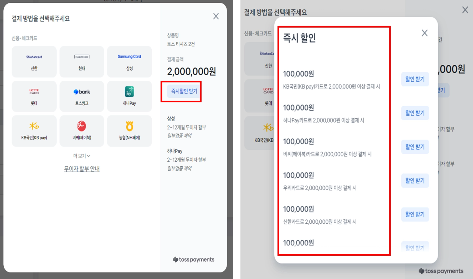ex. 10만원 이상 결제 시 1만원 할인 혹은 5/10/20만원 이상 결제 시 5천원/1만원/2만원 할인