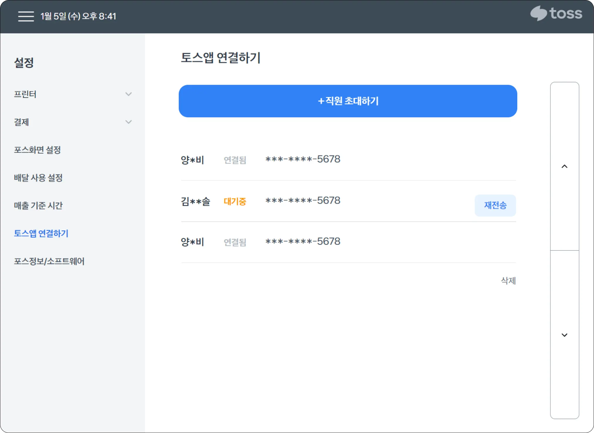 토스포스 왼쪽 상단 ≡버튼 > 설정 > 토스앱 연결하기 > 직원 초대하기를 선택해주세요.