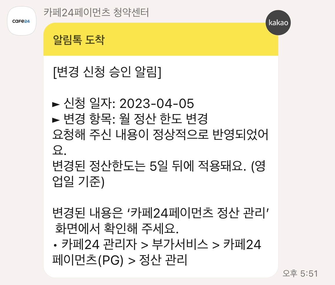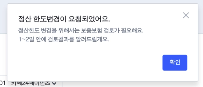 심사완료시 알림톡으로 연락을 드려요. 변경된 정산한도는 5일 뒤에 적용됩니다. (영업일 기준)