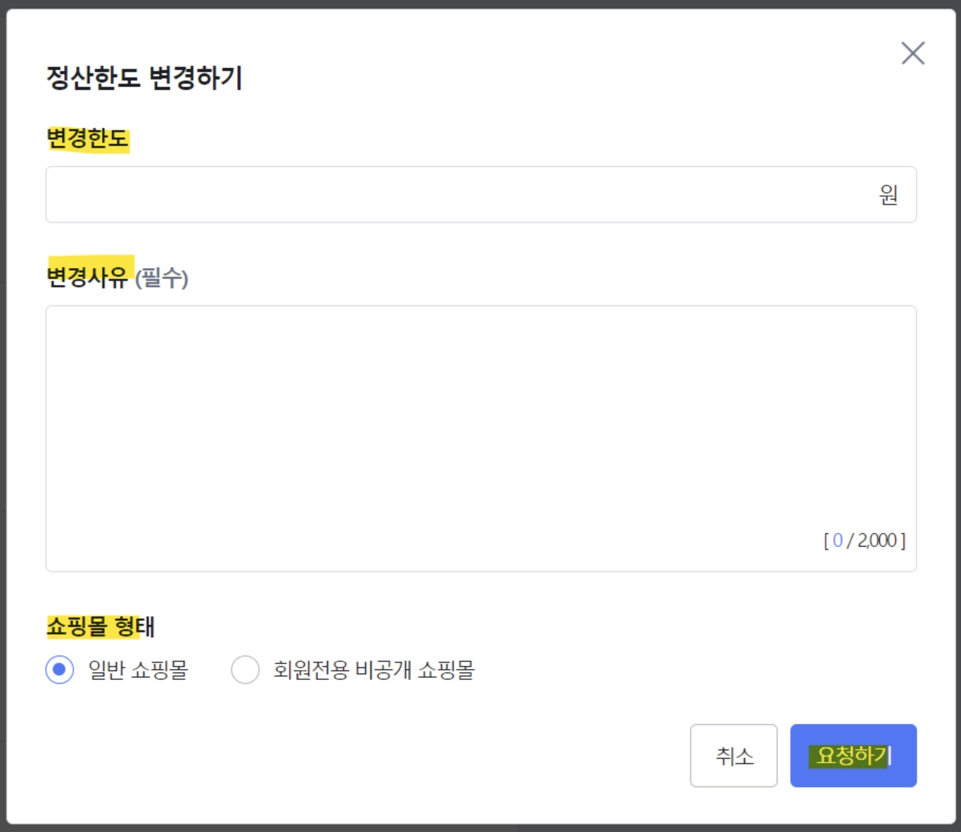 정산한도 상향 요청 금액과 변경사유를 입력해주세요