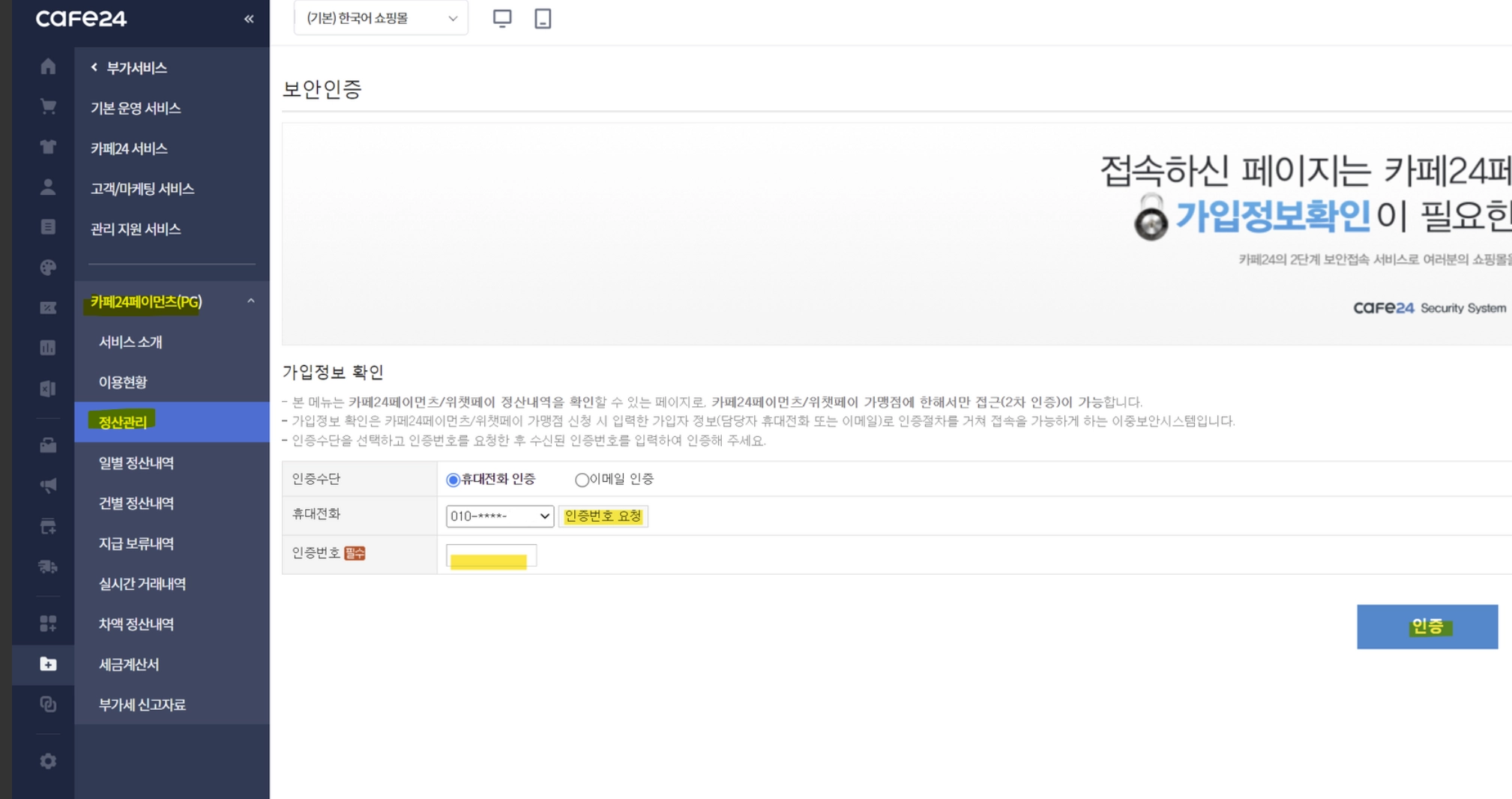 바로 이동 : 부가서비스 > 카페24페이먼츠(PG) > 정산관리
