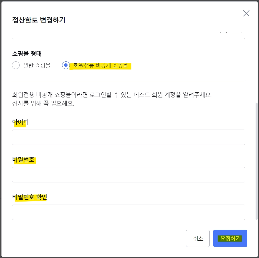 쇼핑몰 형태를 선택해주세요. 회원전용 비공개 쇼핑몰인 경우, 테스트 회원계정을 입력해주세요.