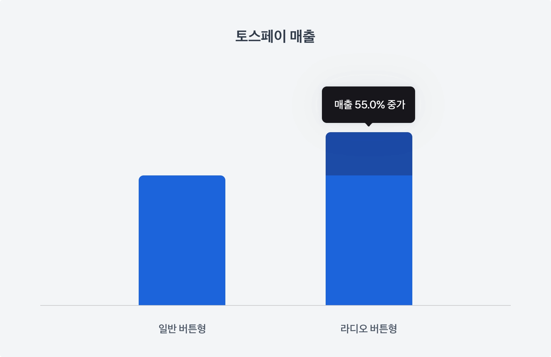 A가맹점에서 토스페이 프로모션을 실험한 결과 라디오 버튼형이 일반 버튼형에 비해 토스페이 결제 시도율이 8.8%p 높았고 매출은 55.0% 더 많았어요. 고객이 혜택을 더 잘 인지하게 되면서 지표에도 좋은 영향이 있었던 것으로 보여요.
