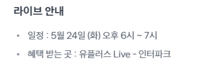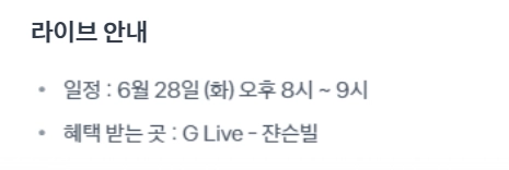 라이브 시간, 메인 타이틀, 라이브 혜택을 확인할 수 있습니다.