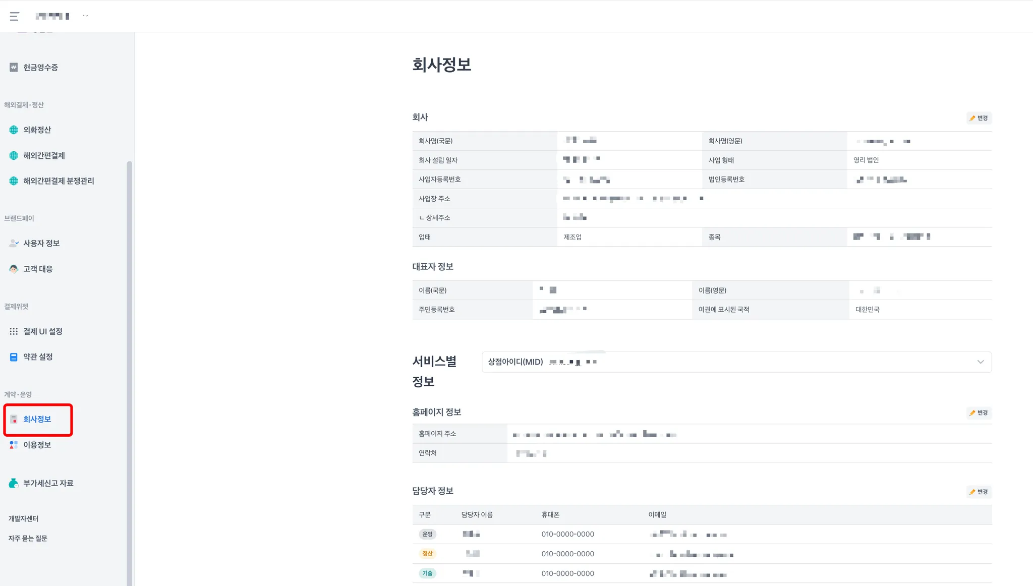 좌측 사이드바에서 회사정보를 선택하세요.