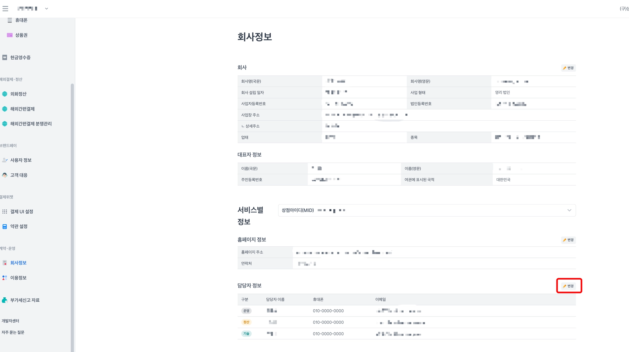담당자 정보 변경을 눌러주세요.