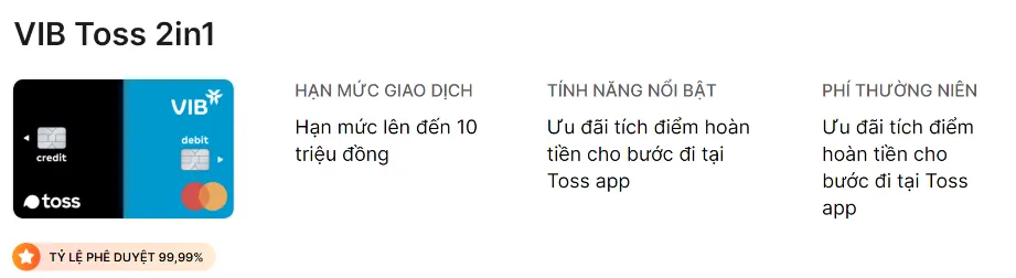 Thẻ Toss-VIB 2in1 là sự kết hợp giữ thẻ ghi nợ và thẻ tín dụng được ngân hàng VIB tạo riêng cho người dùng của Toss.