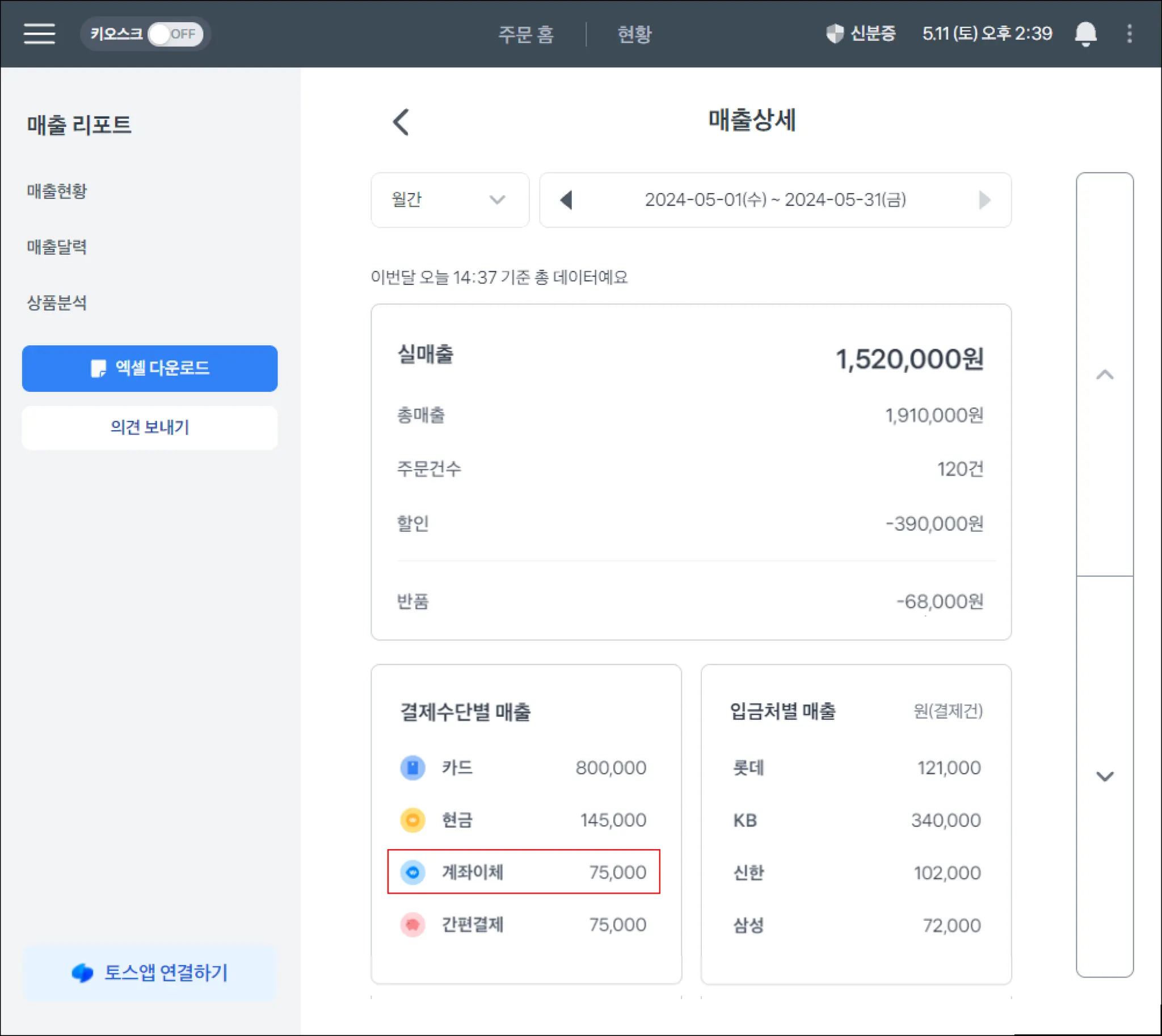 매출 현황, 매출 상세에도 계좌이체 내역이 반영되어 보여져요.