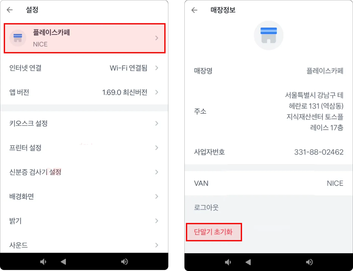 최상단 매장 이름을 누른 뒤, 하단의 [단말기 초기화]를 눌러주세요.