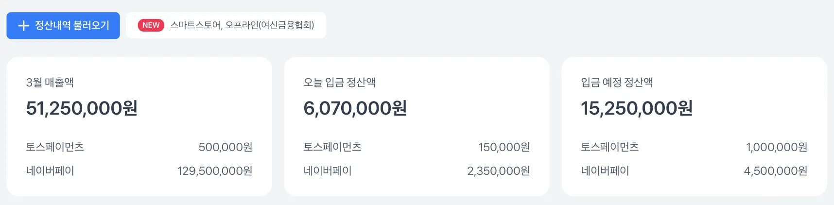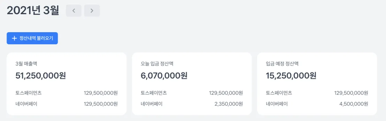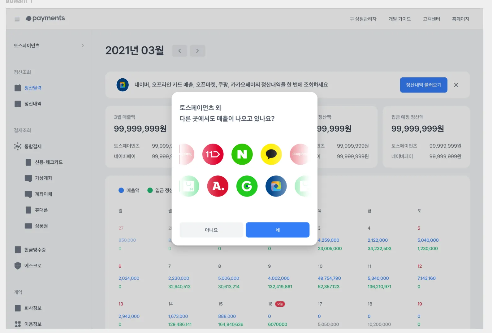 정산내역등으로 자세하게 토스페이먼츠 PG외 판매몰에서 발생한 매출내역을 보여주기