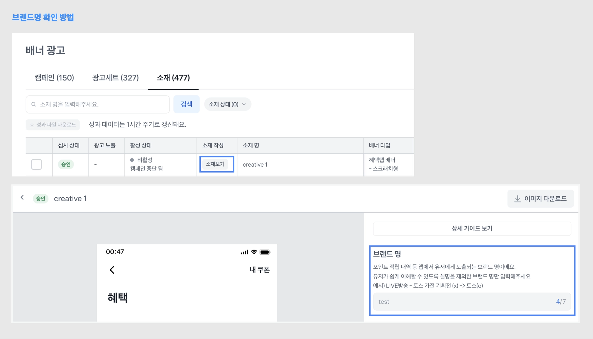소재에 입력된 브랜드명은 해당 소재의 [소재 보기] 클릭 > 우측 브랜드명 영역에서 확인하실 수 있습니다.