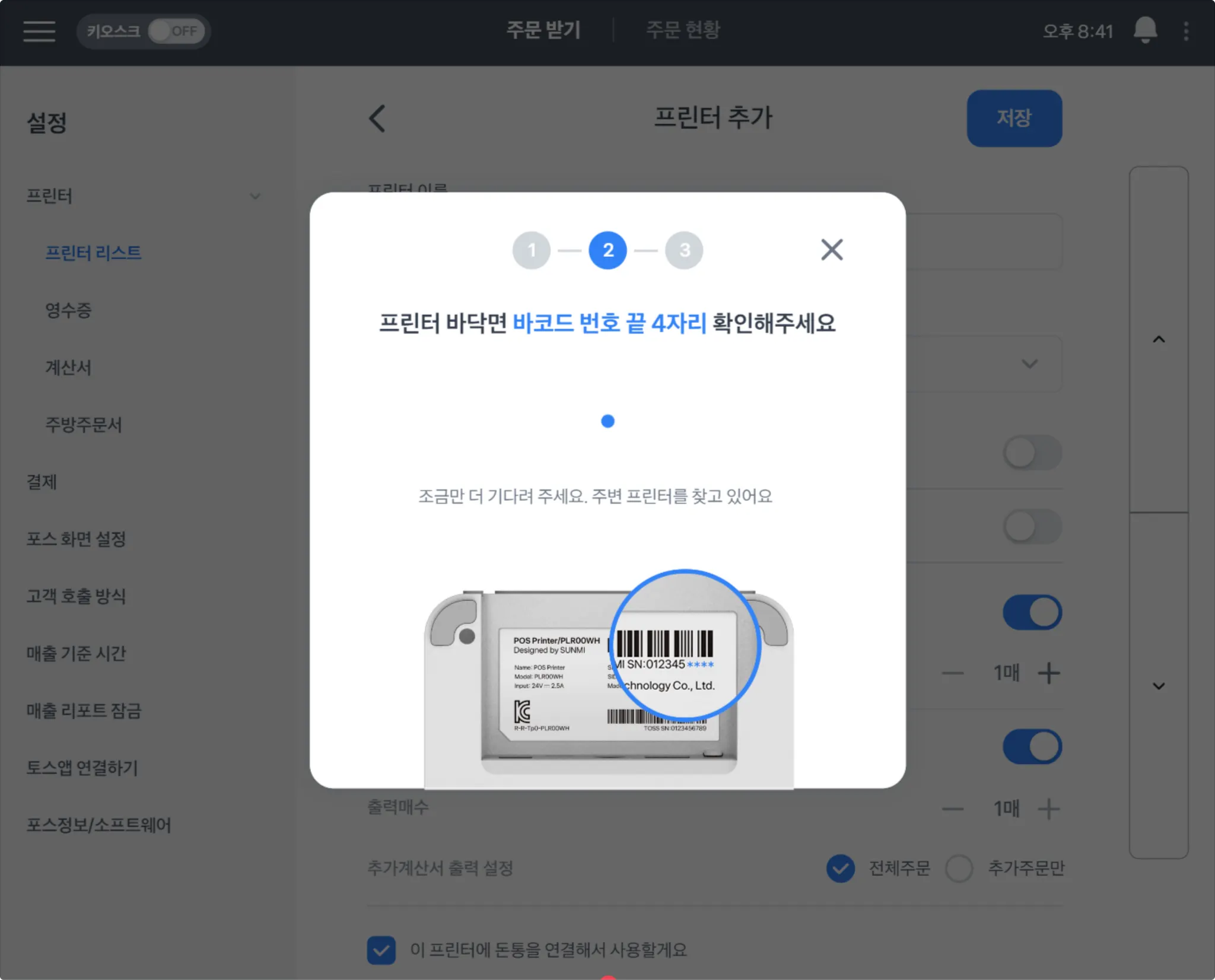 연결을 시작하기 전에, 토스 프린터의 전원이 켜져있는지 다시 한번 확인해주세요.