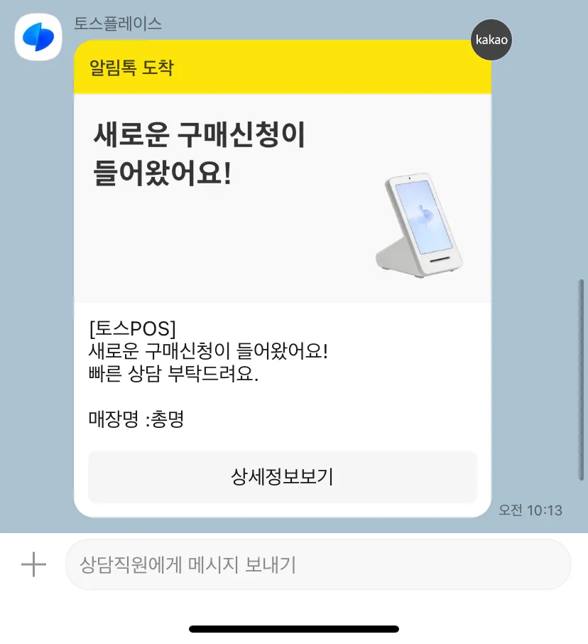 점주의 구매신청이 완료되면 담당자에게 알림톡이 발송됨