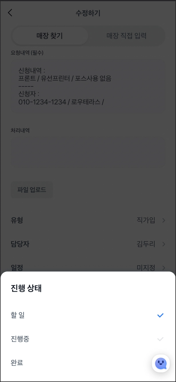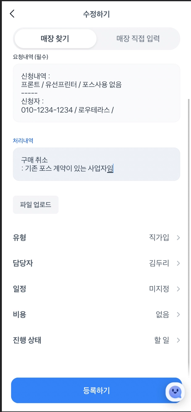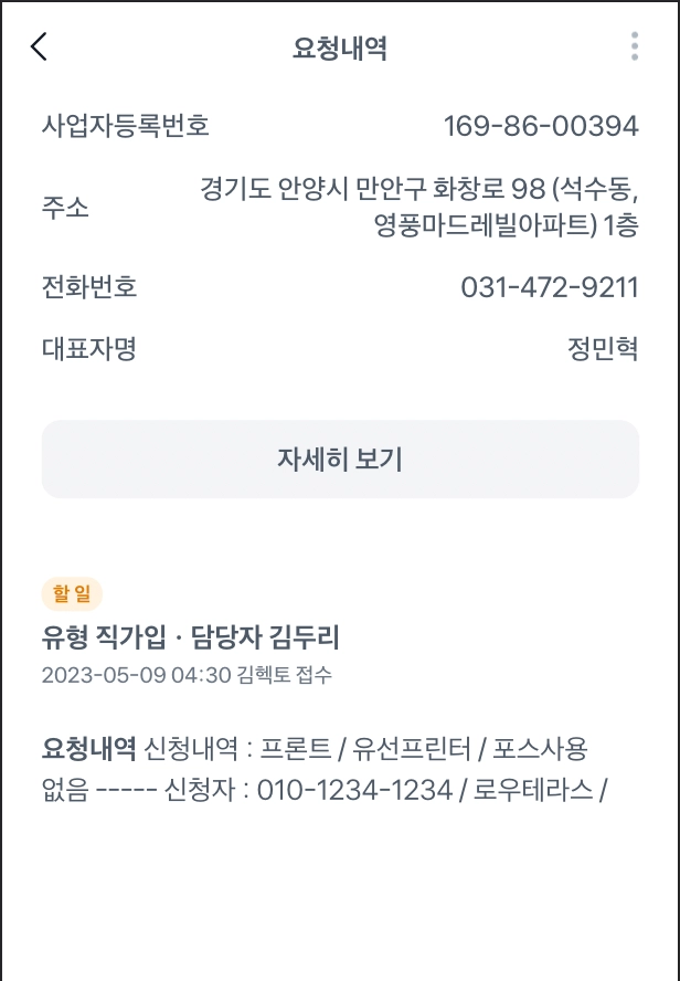 신청 내역과 신청자의 전화번호와 매장명이 ‘요청내역’에 표시됨