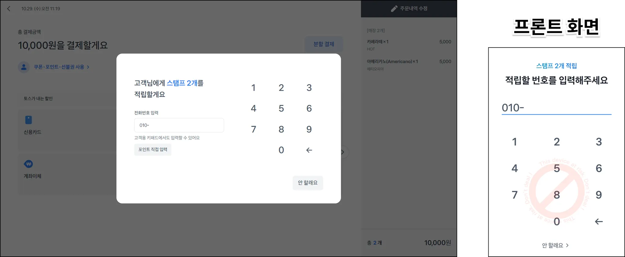 적립 할 고객의 휴대전화번호는 프론트 화면에서도 입력할 수 있어요.