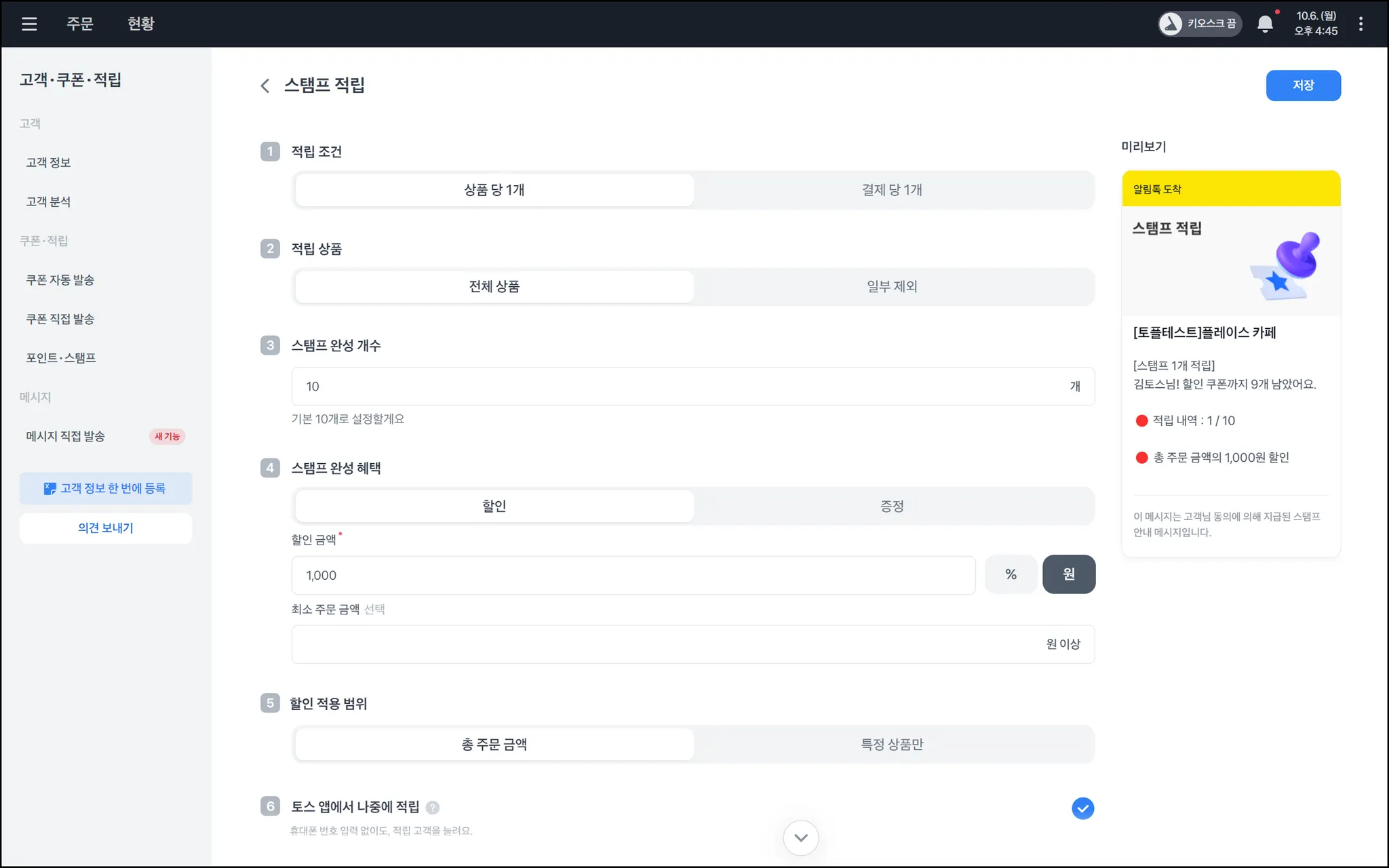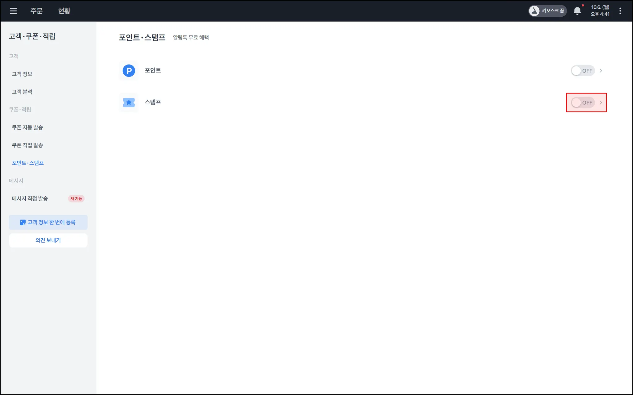 토스포스 좌측 상단 ≡ → 포인트·스탬프 메뉴를 눌러, 스탬프 기능을 ON으로 변경해요.