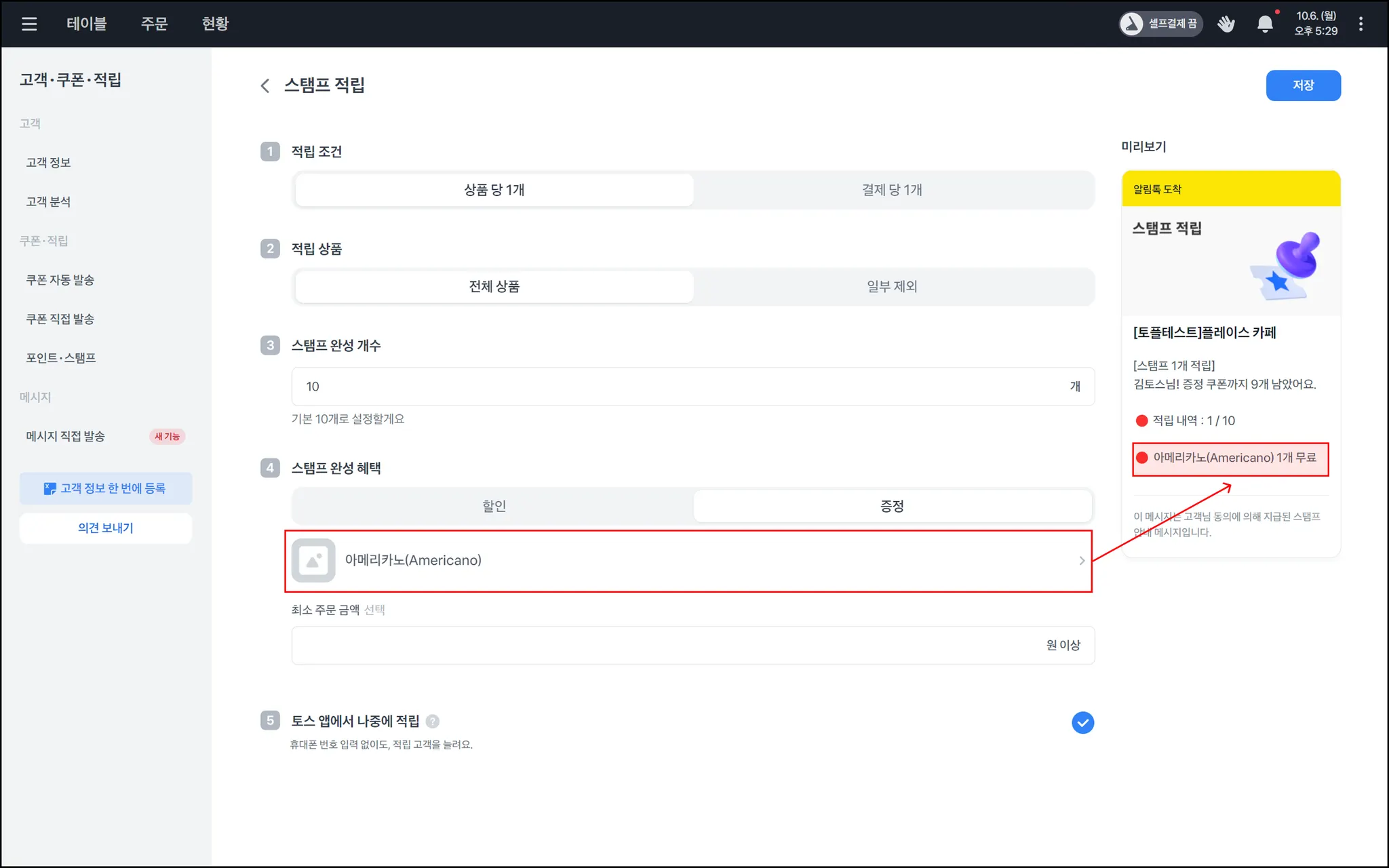 토스POS에서 메뉴를 넣으면, 설정한 적립 조건에 따라 고객 화면에서 스탬프 적립 갯수가 보여져요.
