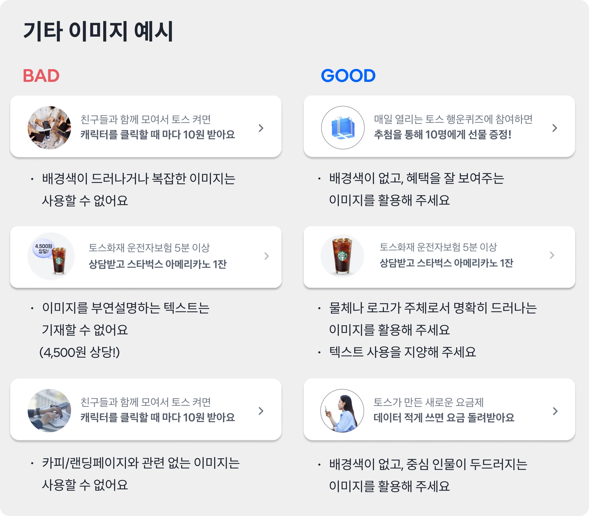 토스가 연상되어 광고를 집행하는 브랜드를 오인할 수 있는 이미지는 사용할 수 없습니다.