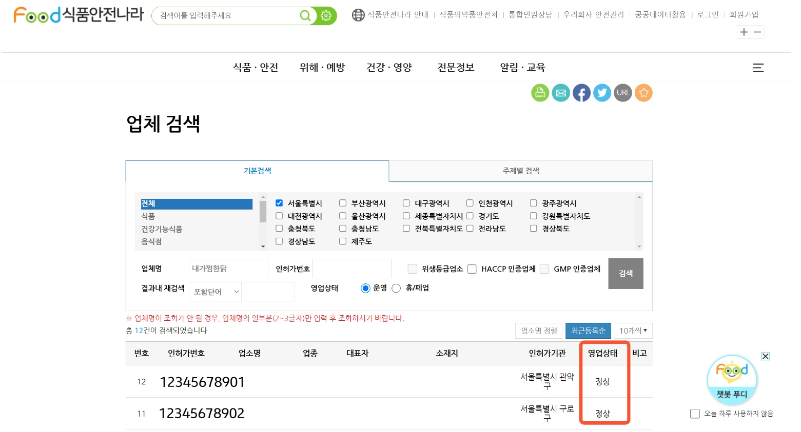 식품안전나라 홈페이지 하단 업체 검색에서 조회할 수 있어요