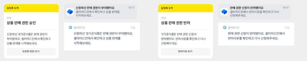 셀러 분들께 ‘승인 여부’ 를 실시간으로 알려드리기 위해 변경되었어요. 이제 셀러어드민 내에서 진행 상황 및 승인 / 반려 모두 알림톡으로 보내드릴게요.