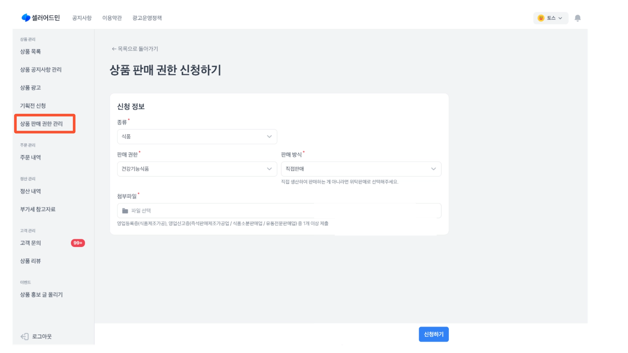식품 권한을 신청 후 셀러어드민 → 상품 판매 권한 관리 → 신청내역을 조회해 주세요.