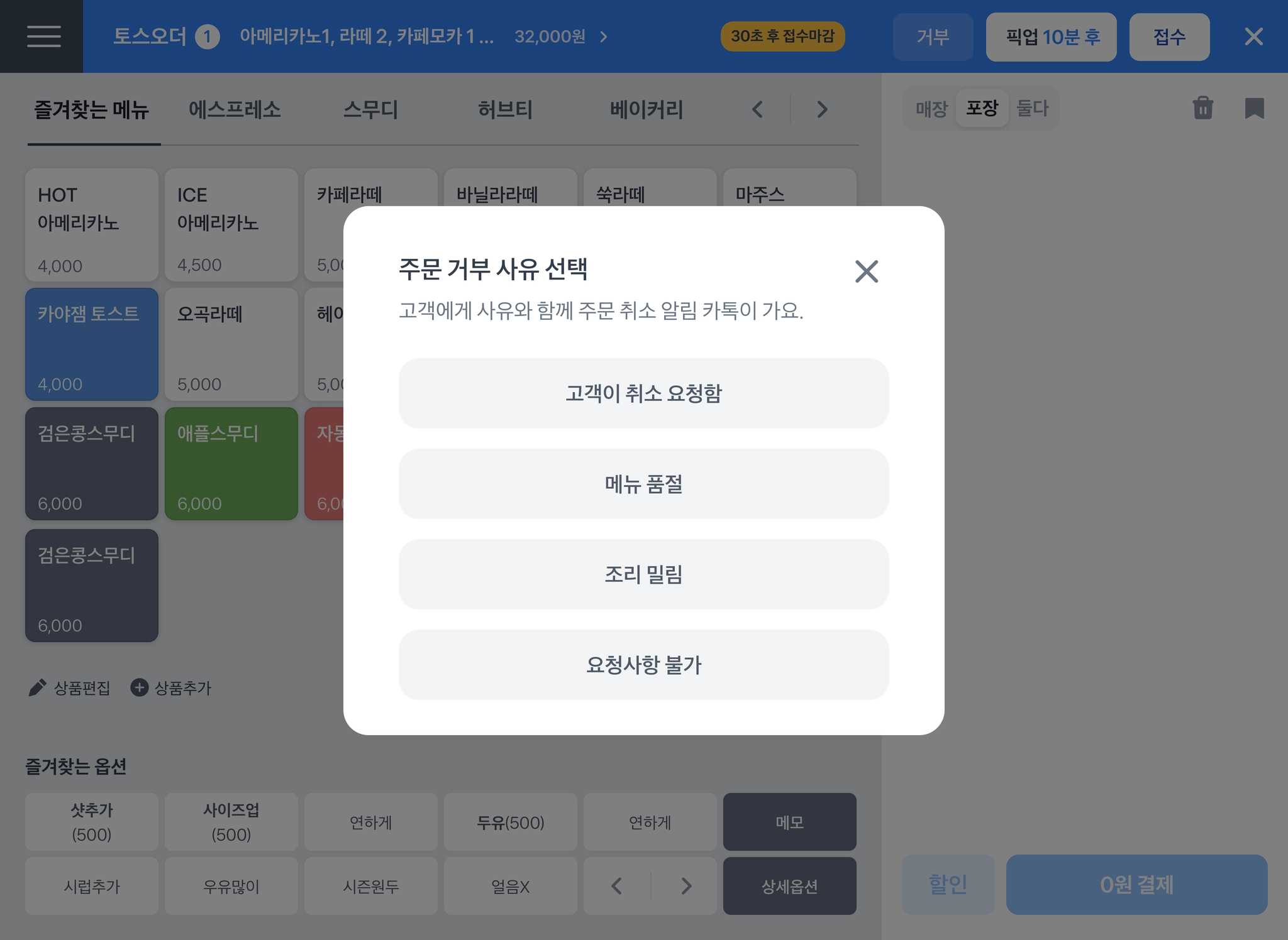 거부 사유 중 [메뉴 품절] 선택 시 해당 메뉴가 자동으로 포스에서 품절 반영되고, 이후 키오스크 및 토스오더를 통한 주문이 불가해요.