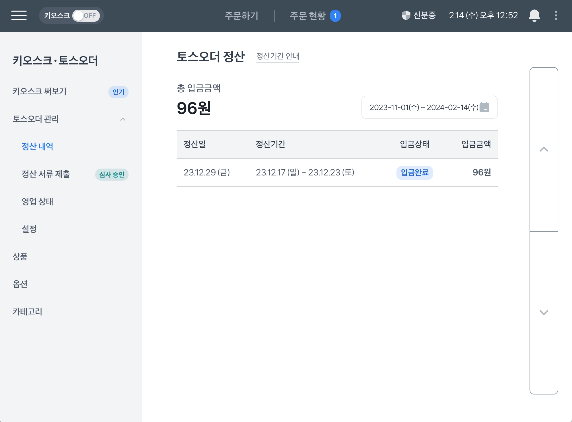 포스 좌측 상단 ≡ > 토스오더 관리에서 정산 서류 제출