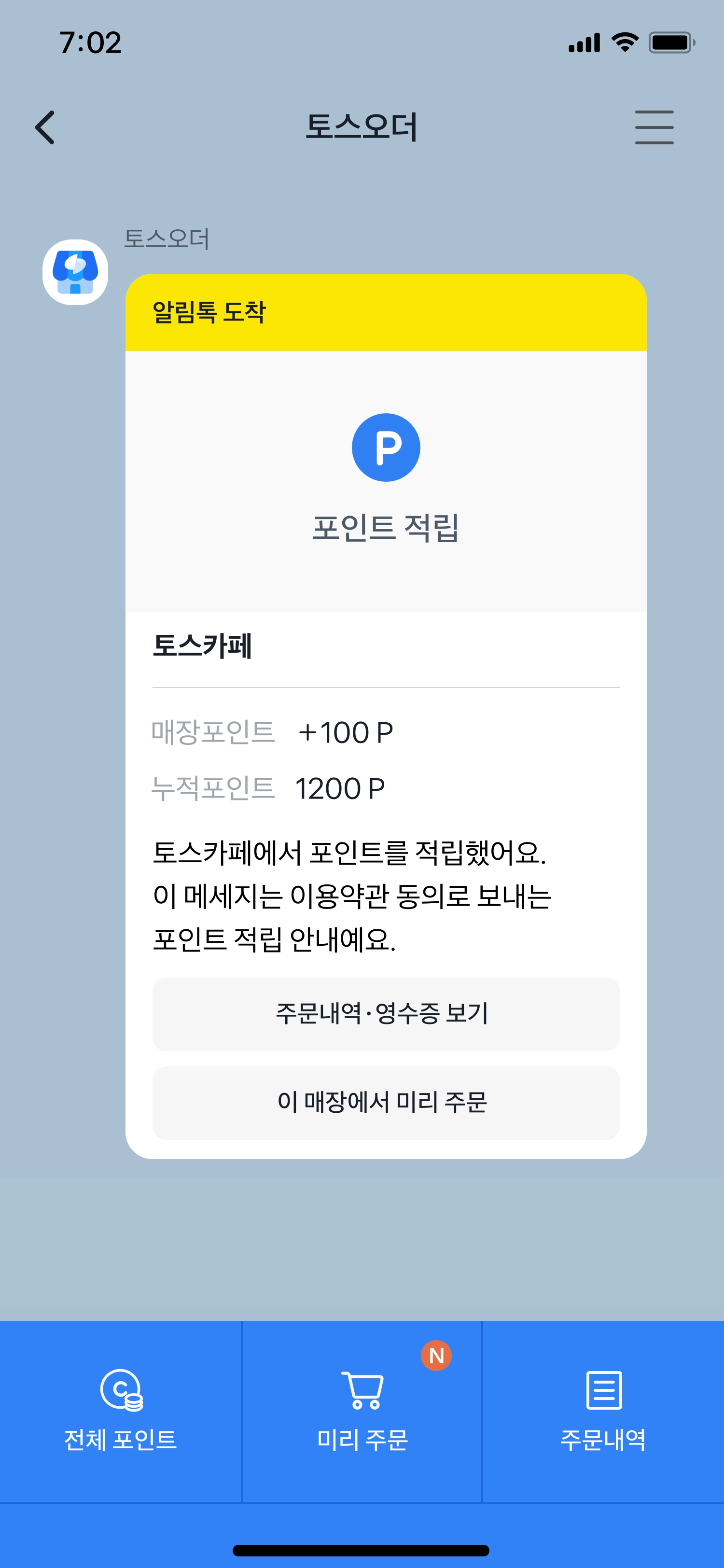 3. 카카오톡에서 토스오더 채널로 포인트 적립 알림톡이 발송돼요.