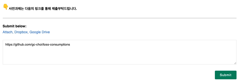 과제를 수행하신 GitHub 저장소 링크를 가장 하단 textarea에 입력하신 후 Submit 버튼을 눌러주세요.