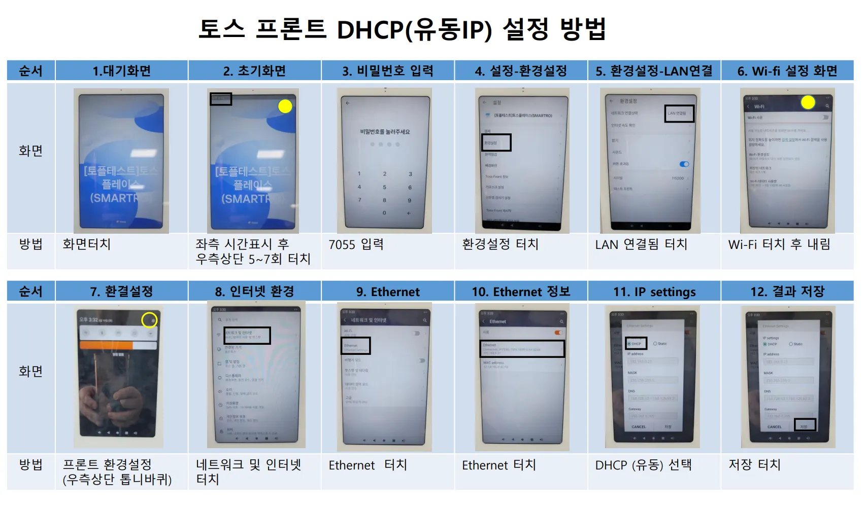메인 화면 터치 후, 설정 비밀번호 4자리: 7055를 눌러주세요.