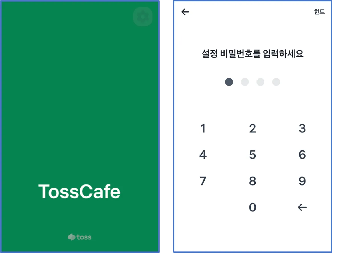 아이콘을 누르면, 관리자 암호 입력 화면이 보여요. (설정 아이콘은 5초가 지나면 다시 사라져요.)