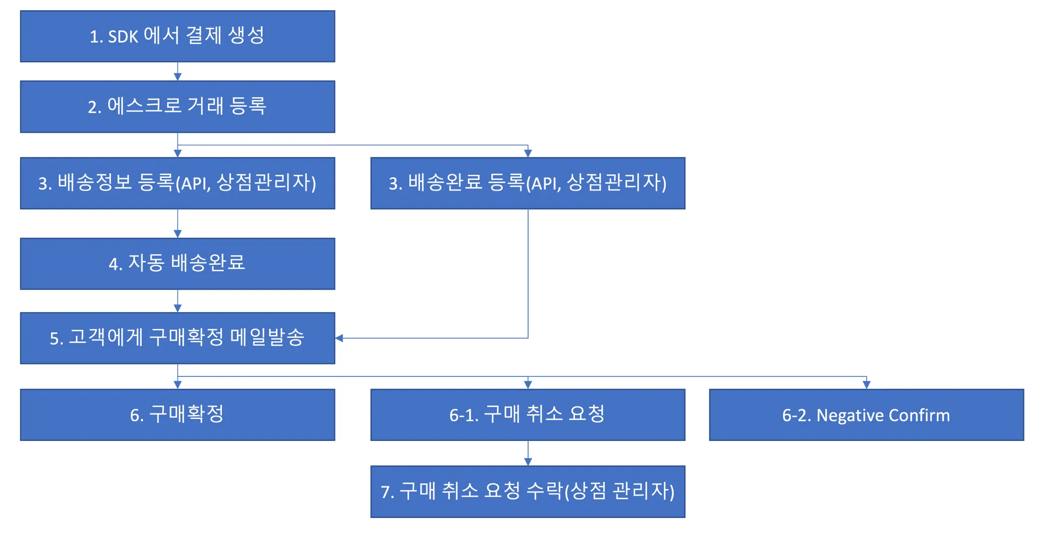 기본적으로 에스크로가 적용된 거래건에 대해 아래의 에스크로 결제 흐름도에 따라 동작합니다.