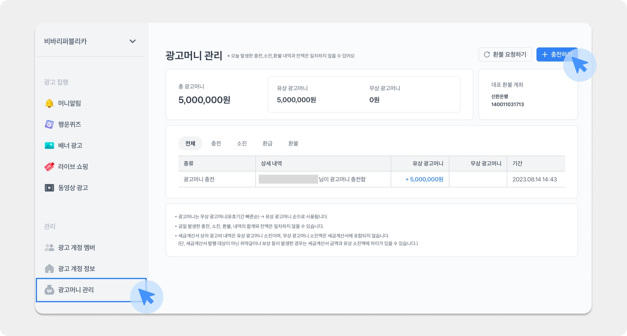 <광고머니 관리> 메뉴의 우측 상단 <+충전하기> 버튼을 클릭하여 희망하는 금액만큼 광고머니를 충전할 수 있습니다. 충전 후 사용하지 않은 광고머니는 환불을 요청할 수 있습니다.