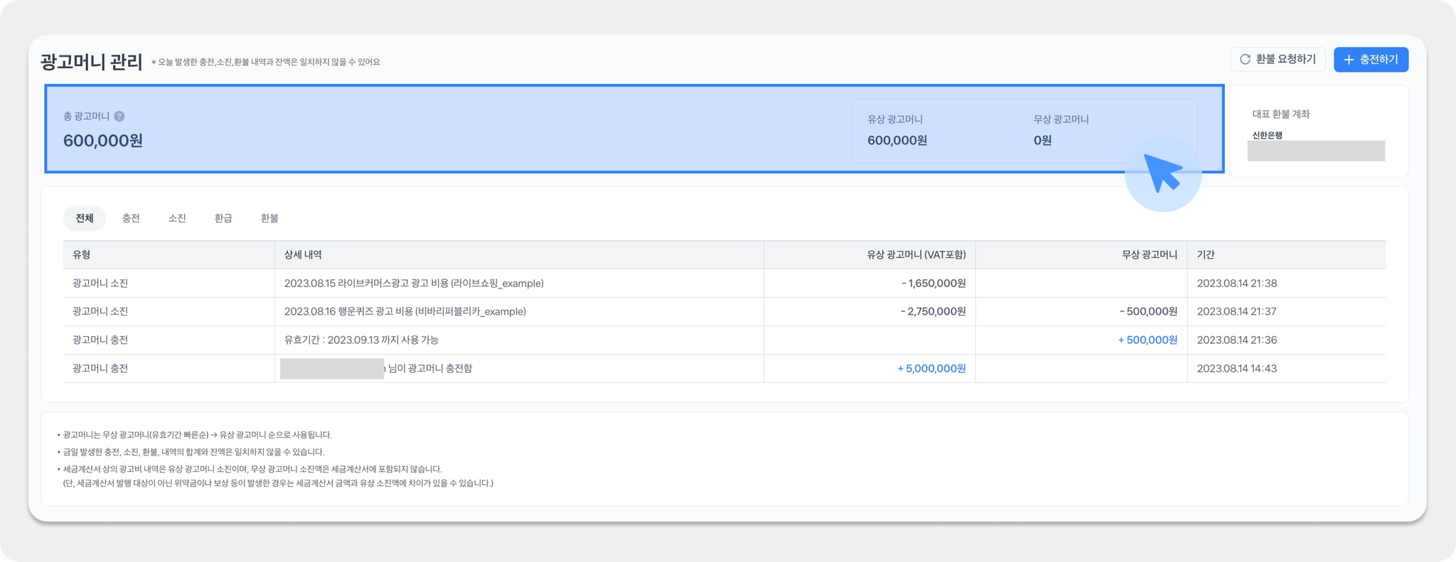 해당 메뉴를 통해, 광고주께서는 광고머니 충전과 더불어 광고머니 잔액, 내역을 조회할 수 있습니다.