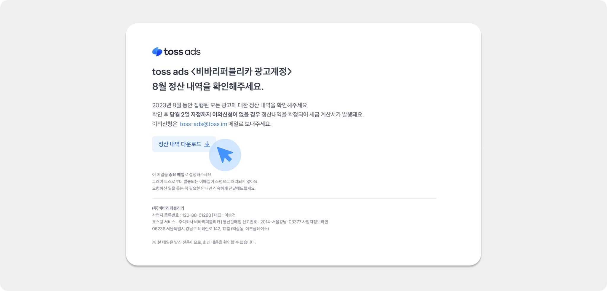 ※ 세금계산서 수정 발행이 필요한 경우, toss-ads@toss.im 메일로 문의주시면 확인 후 필요한 지원을 도와드립니다.