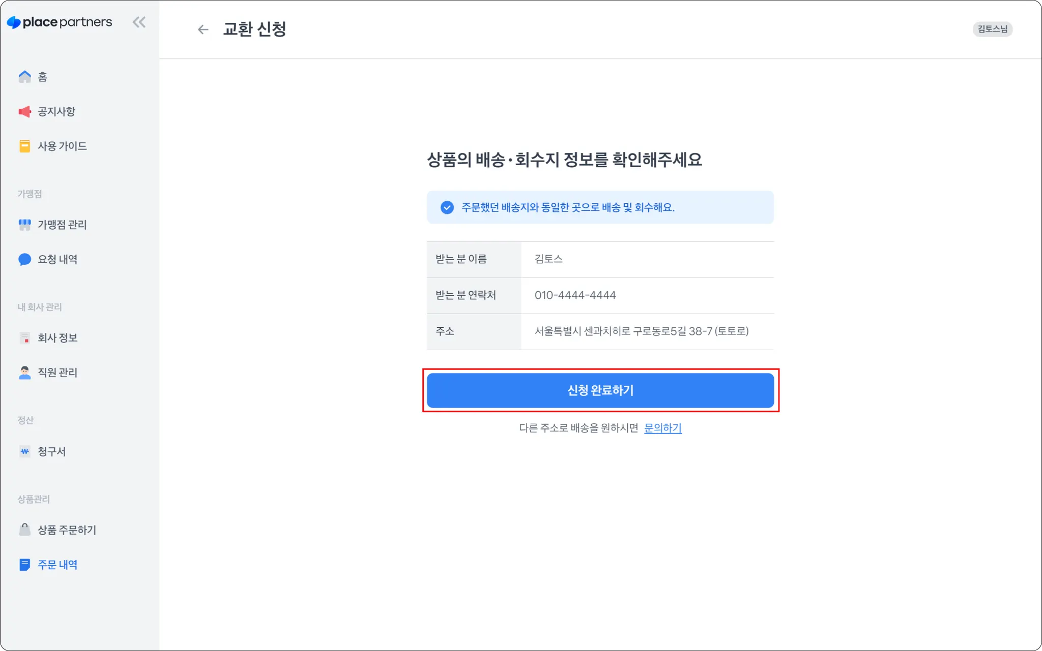 회수는 무조건 주문했던 배송지 정보로만 가능해요.