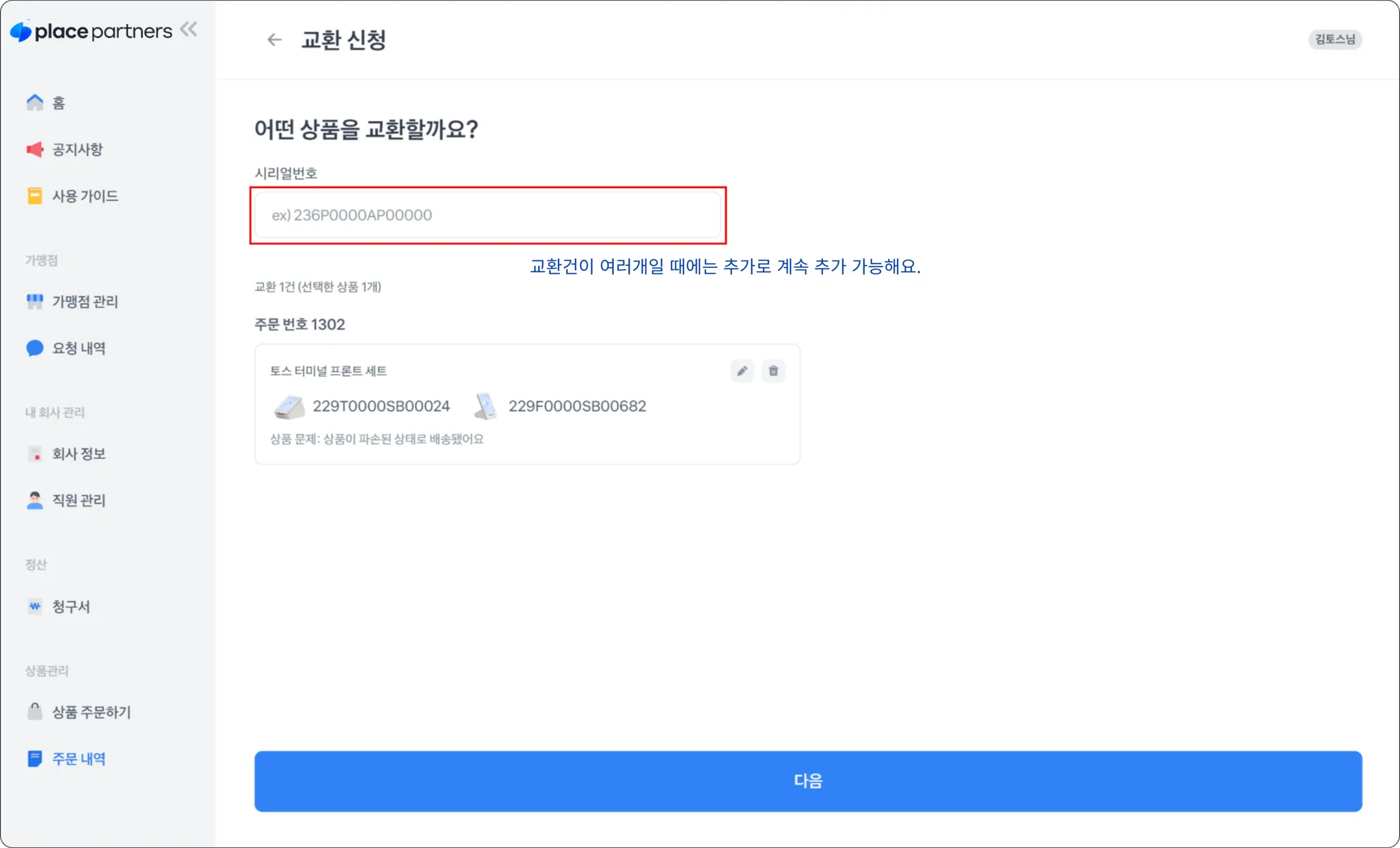 교환/반품 상품이 여러개 일 때에는 계속 시리얼 넘버로 추가 할 수 있어요.
