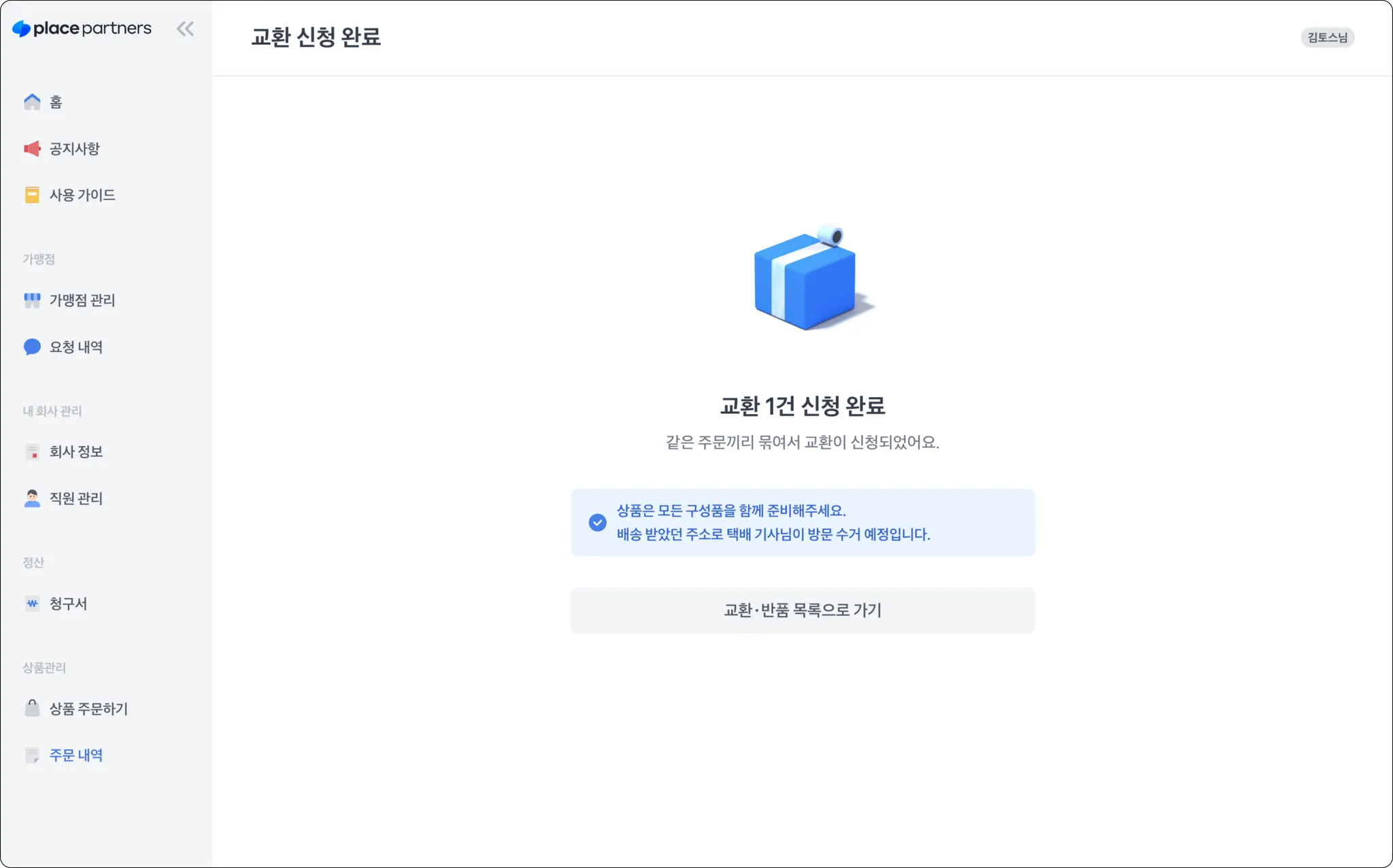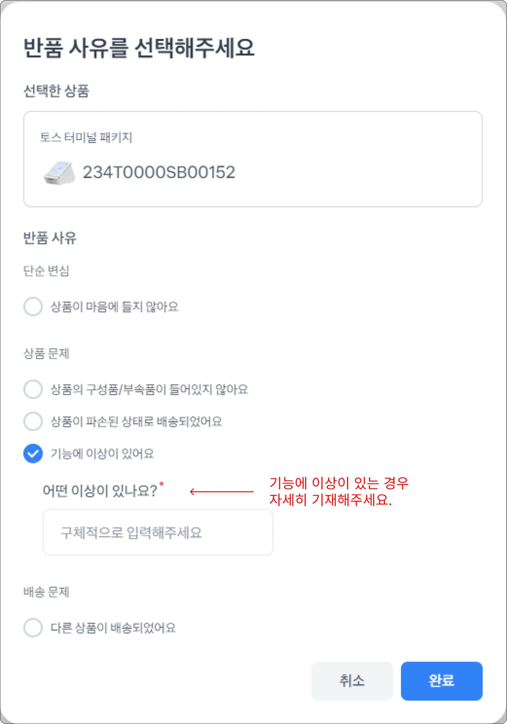 교환/반품 사유를 정확하게 체크하고 완료 버튼을 눌러주세요.
